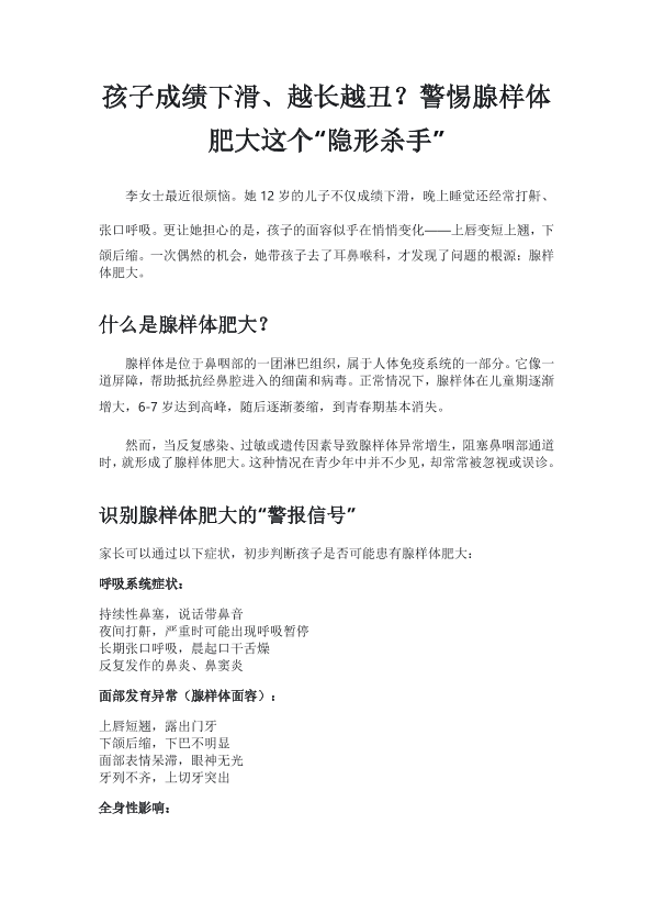 孩子成绩下滑,越长越丑?警惕“腺样体肥大”这个隐形杀手
