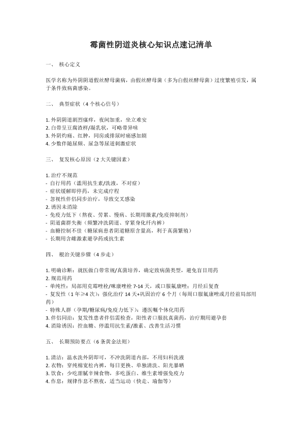 霉菌性阴道炎核心知识点速记清单