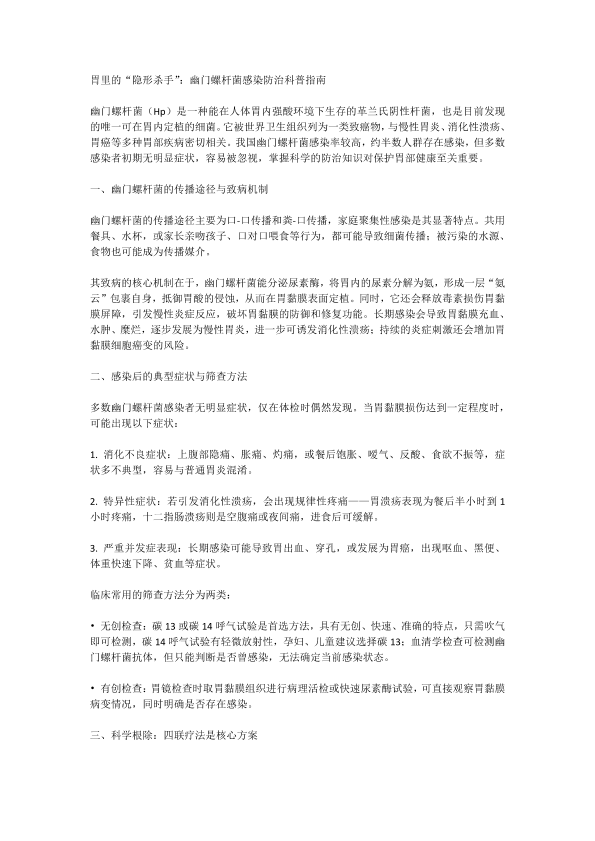 胃里的“隐形杀手”:幽门螺杆菌感染防治科普指南