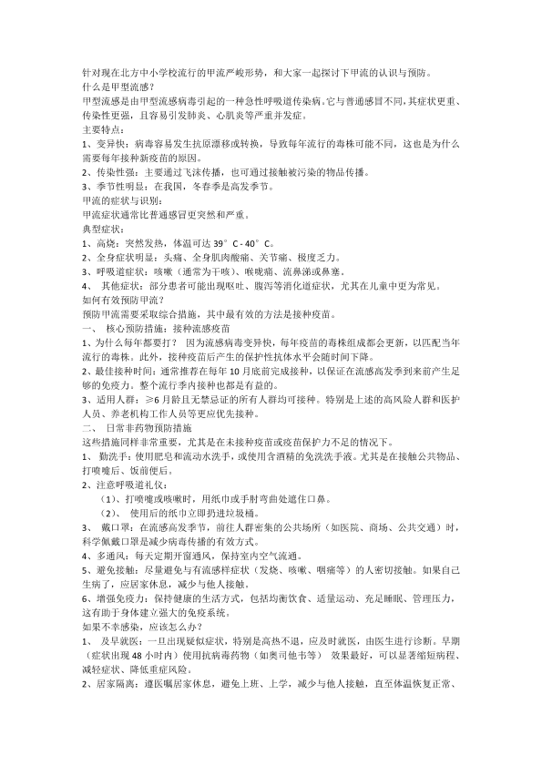北方中小学校甲流预防与治疗