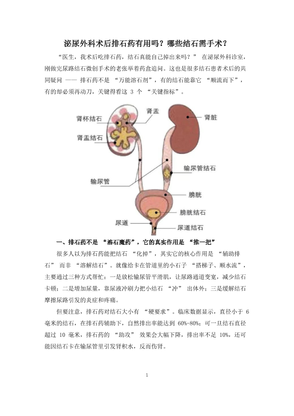 泌尿外科术后排石药有用吗?哪些结石需手术?