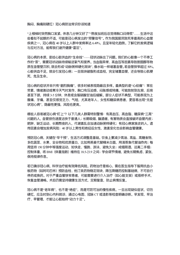 胸闷、胸疼别硬抗!冠心病防治常识你该知道