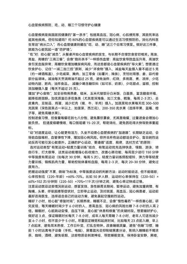 心血管疾病预防,吃、动、睡三个习惯守护心健康