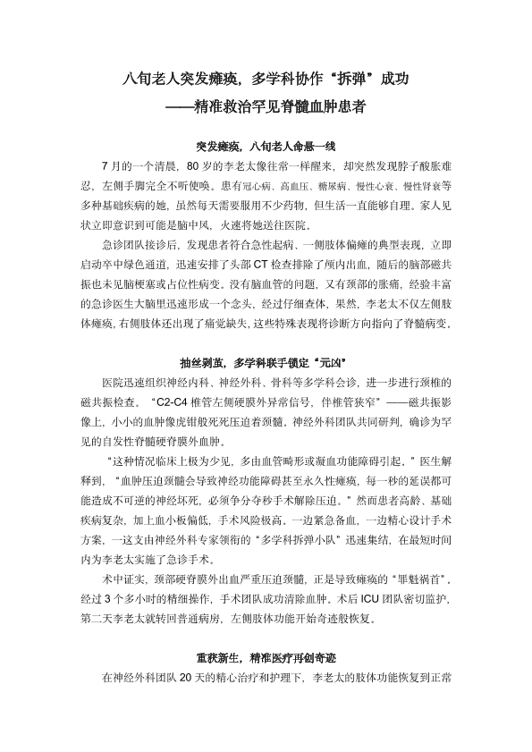 八月老人突发瘫痪,多学科协作“拆弹”成功