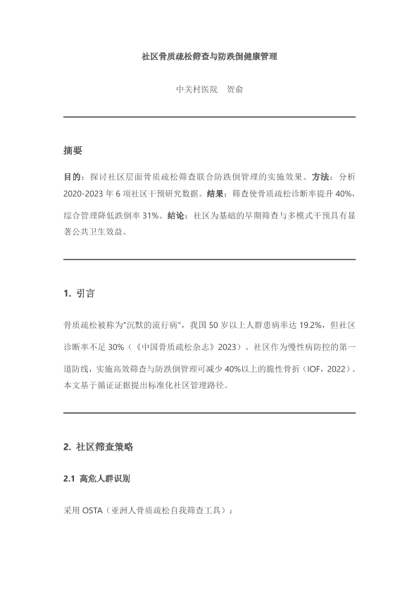 社区骨质疏松筛查与防跌倒健康管理-贺俞