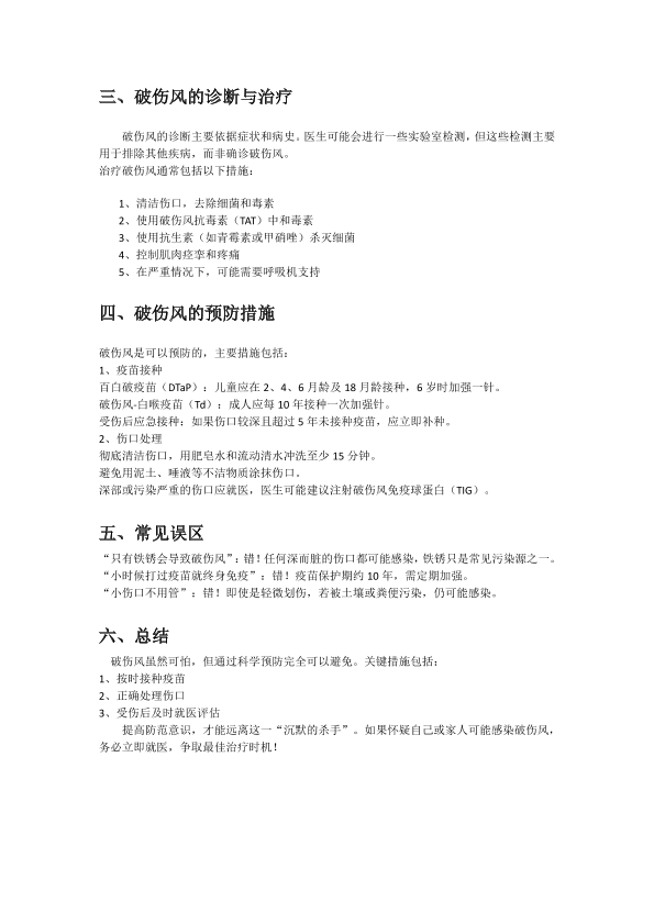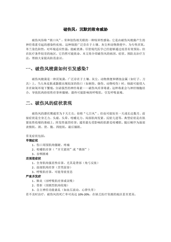 破伤风:沉默的致命威胁。介绍破伤风的病因、症状、预防及治疗方法,帮助大家提高防范意识。