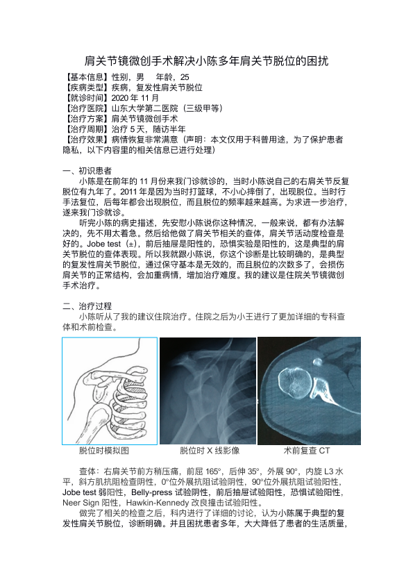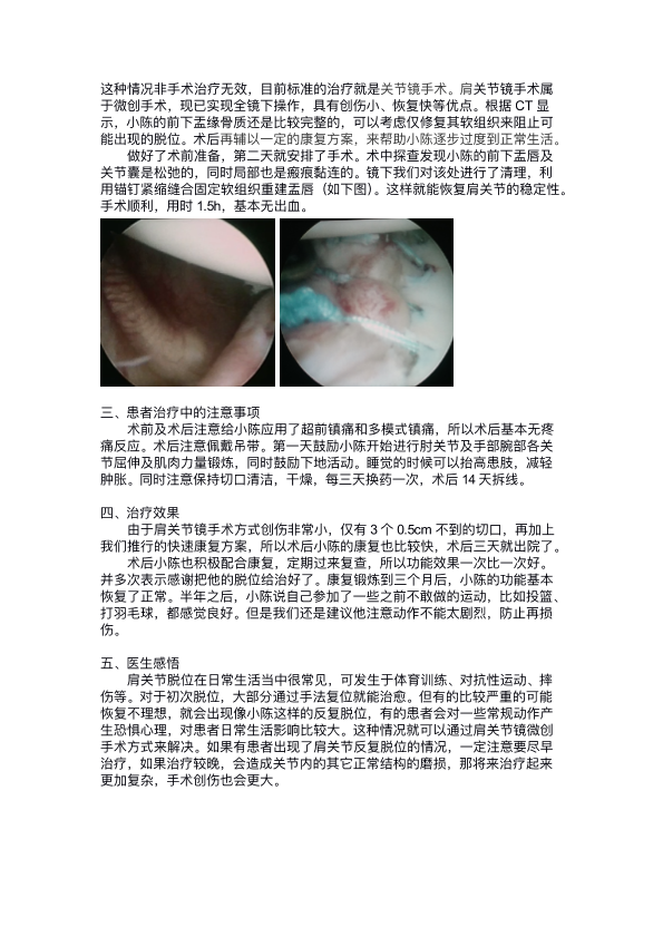 肩关节镜微创手术解决小陈多年肩关节脱位的困扰