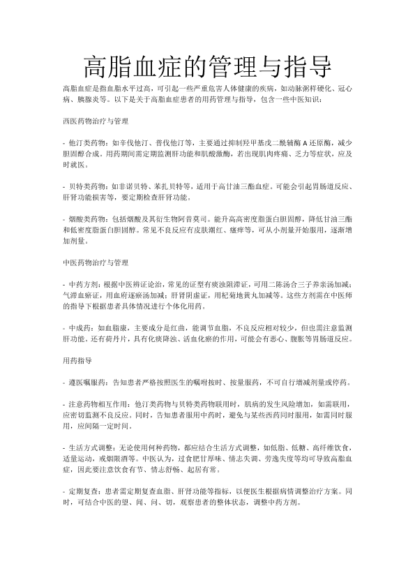 高脂血症患者的用药管理与指导