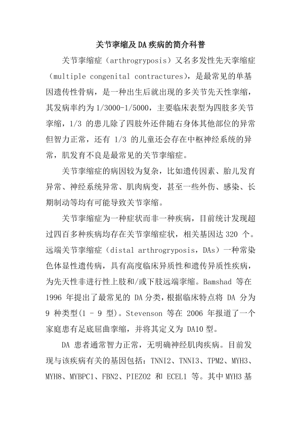 关节挛缩及DA疾病的简介科普