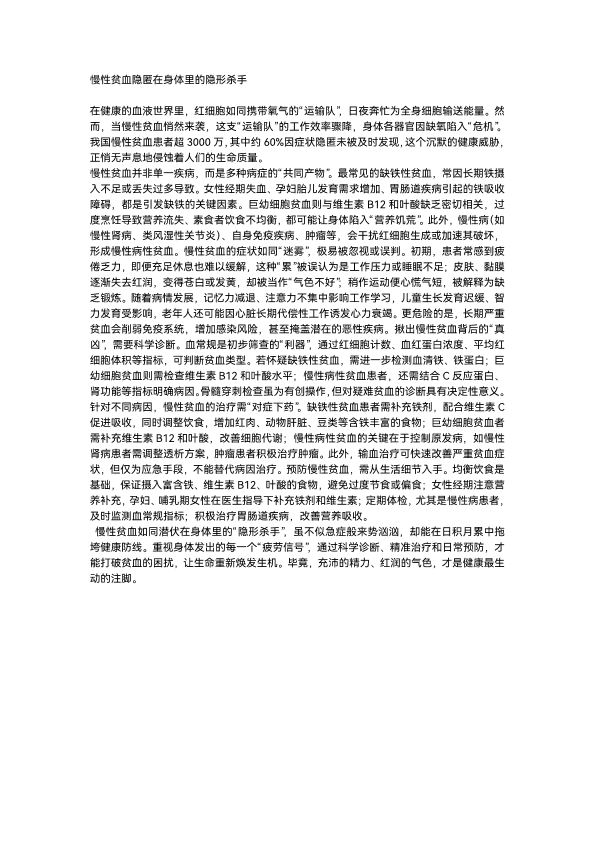 慢性贫血隐匿在身体里的隐形杀手