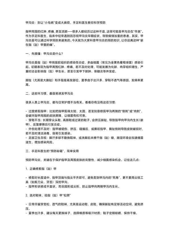甲沟炎:别让小毛病变成大麻烦