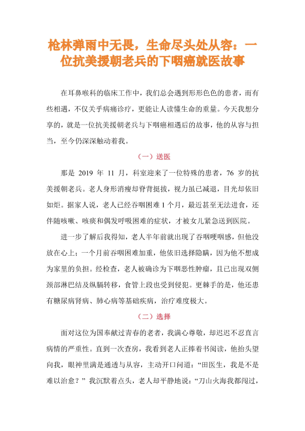 枪林弹雨中无畏,生命尽头处从容:一位抗美援朝老兵的下咽癌就医故事