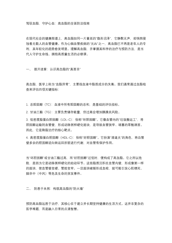 驾驭血脂,守护心血:高血脂的全面防治指南