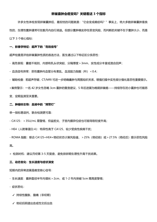 卵巢囊肿会癌变吗?关键看这3个指标