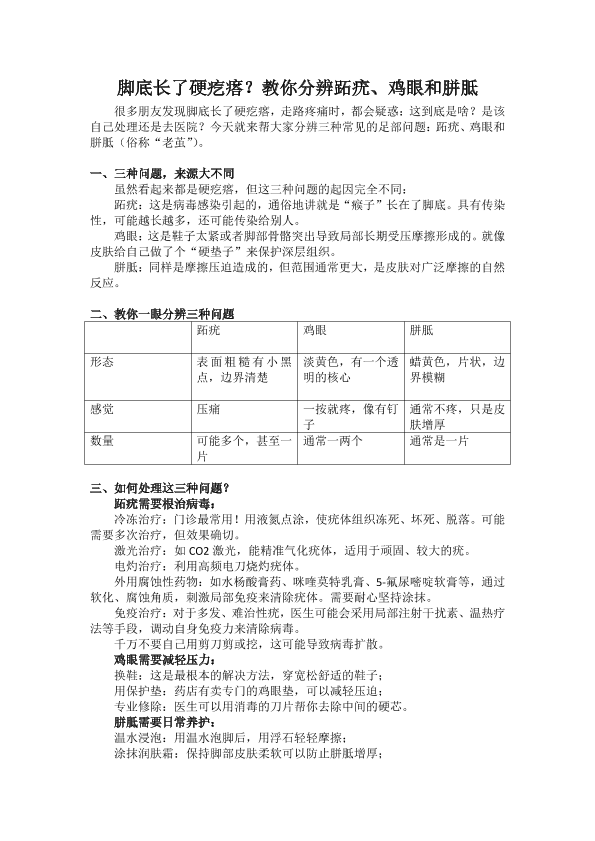 脚底长了硬疙瘩?教你分辨跖疣、鸡眼和胼胝