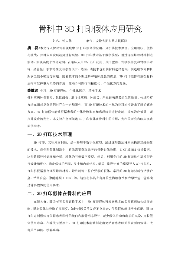 骨科中3D打印假体应用研究