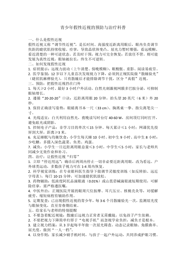 青少年的假性近视的预防与治疗科普
