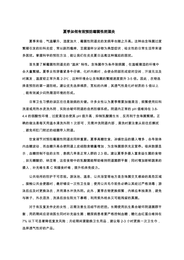 夏季如何有效预防霉菌性阴道炎