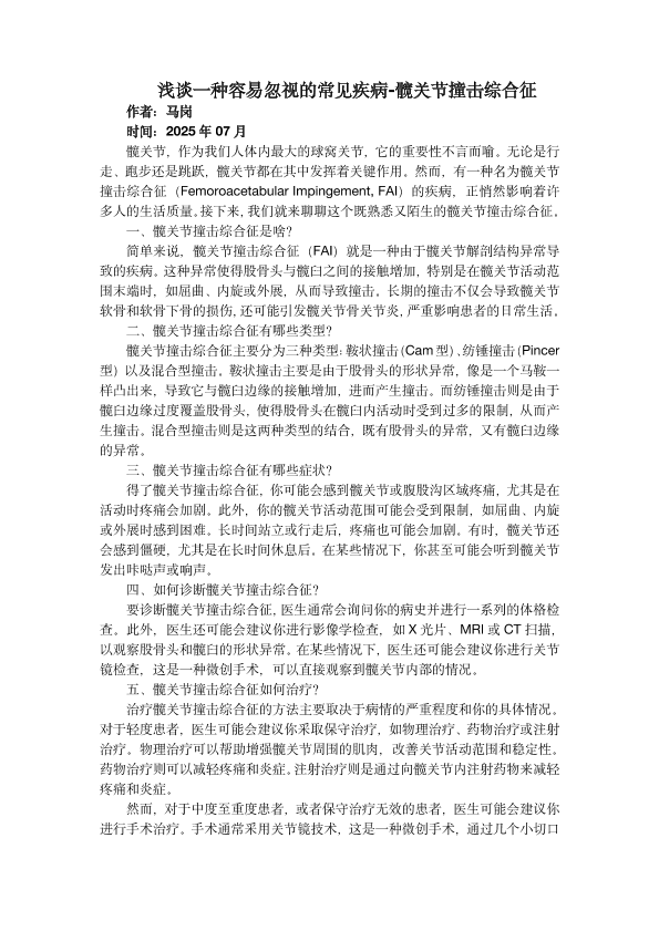浅谈一种容易忽视的常见疾病-髋关节撞击综合征