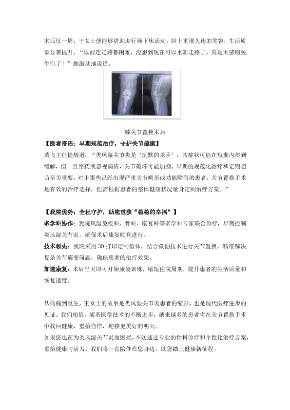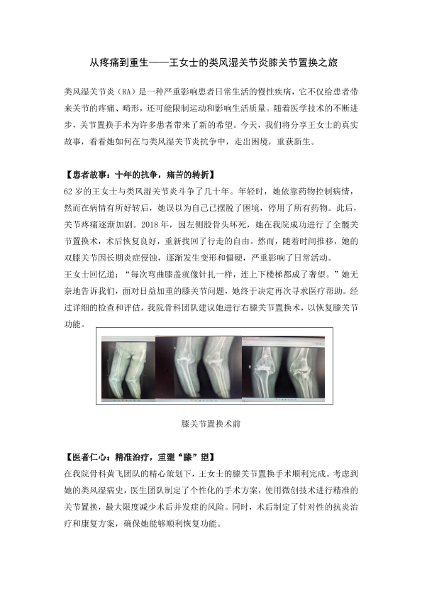从疼痛到重生——王女士的类风湿关节炎膝关节置换之旅