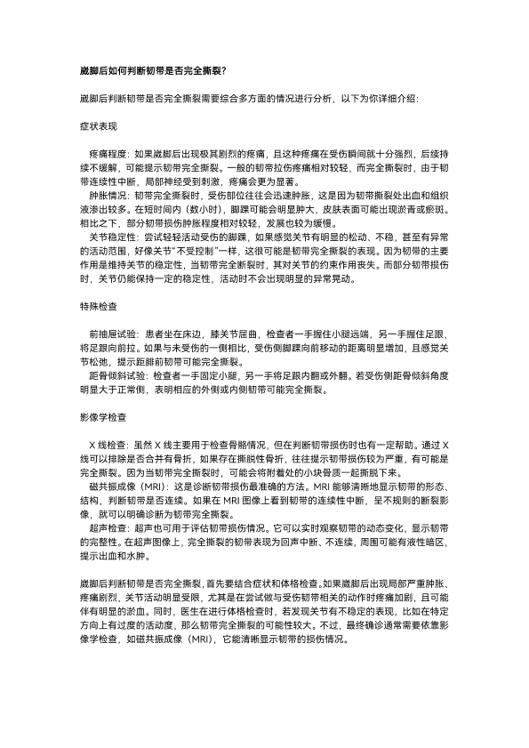 崴脚后如何判断韧带是否完全撕裂