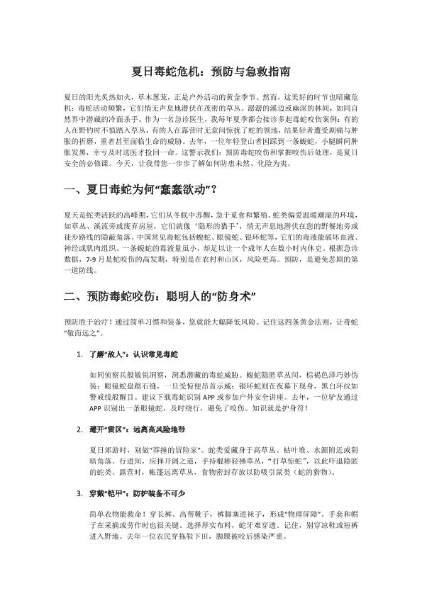 夏季毒蛇咬伤的预防及救治