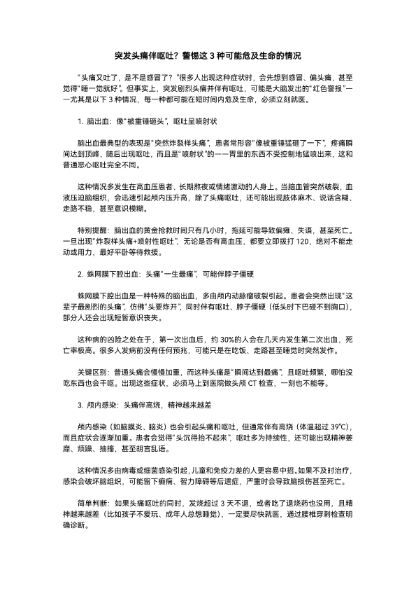 突发头痛伴呕吐?警惕这 3 种可能危及生命的情况