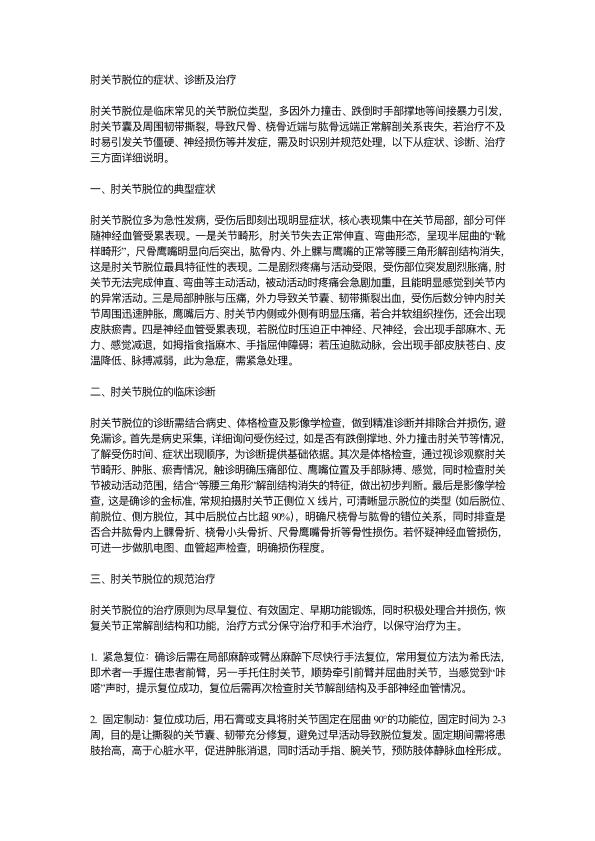 肘关节脱位的症状、诊断及治疗