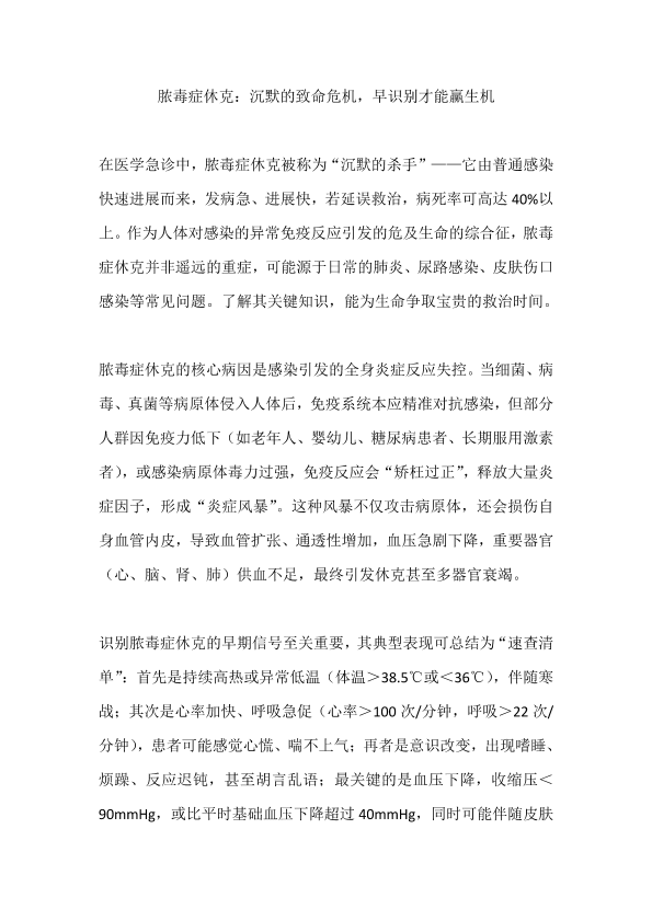 脓毒症休克:沉默的致命危机,早识别才能赢生机
